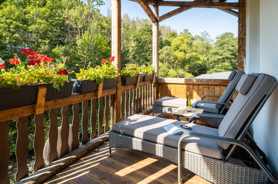 Mit Sitzecke, Boxspringbett und Balkon direkt über dem Fluss.