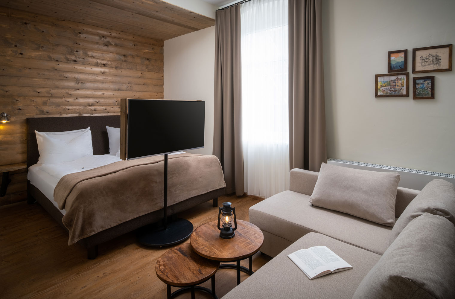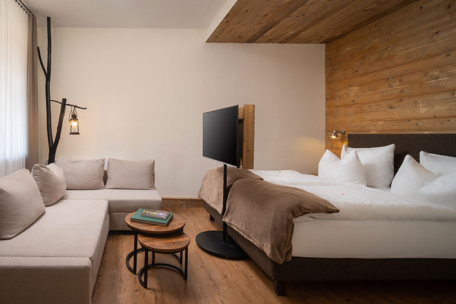 Helles Vierbettzimmer im Stil einer modernen Wanderhütte – ideal für Freunde oder Familien.